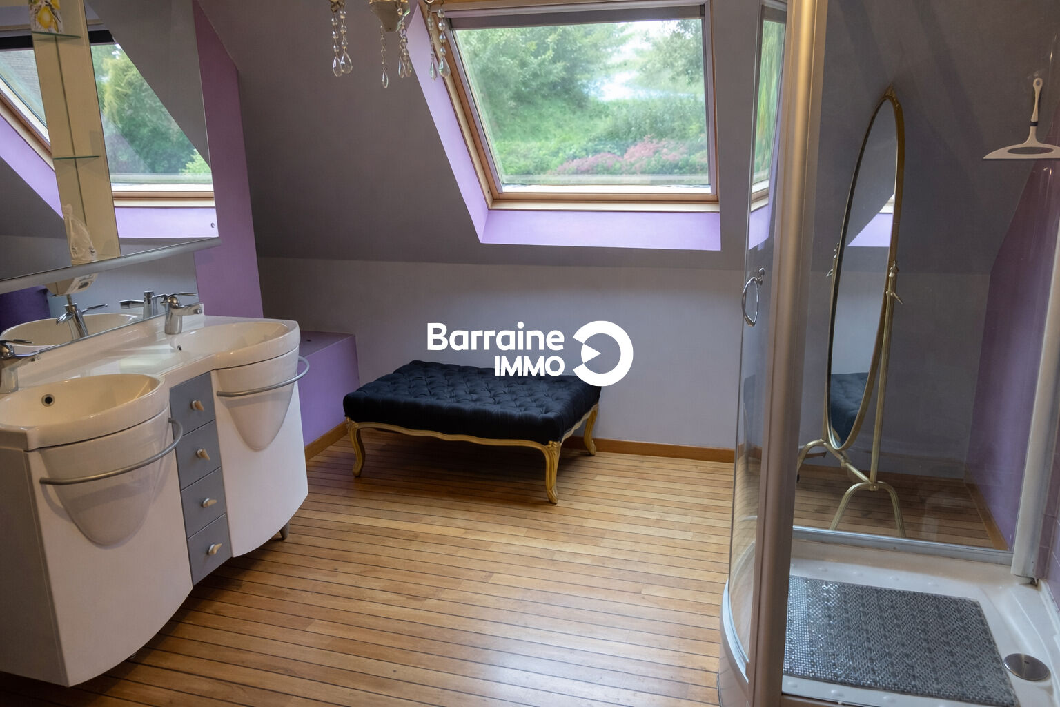 Dans l’autre aile, à l’étage vous retrouverez 2 autres chambres, un bureau et une salle d’eau-wc sur un très joli parquet pont de bateau.