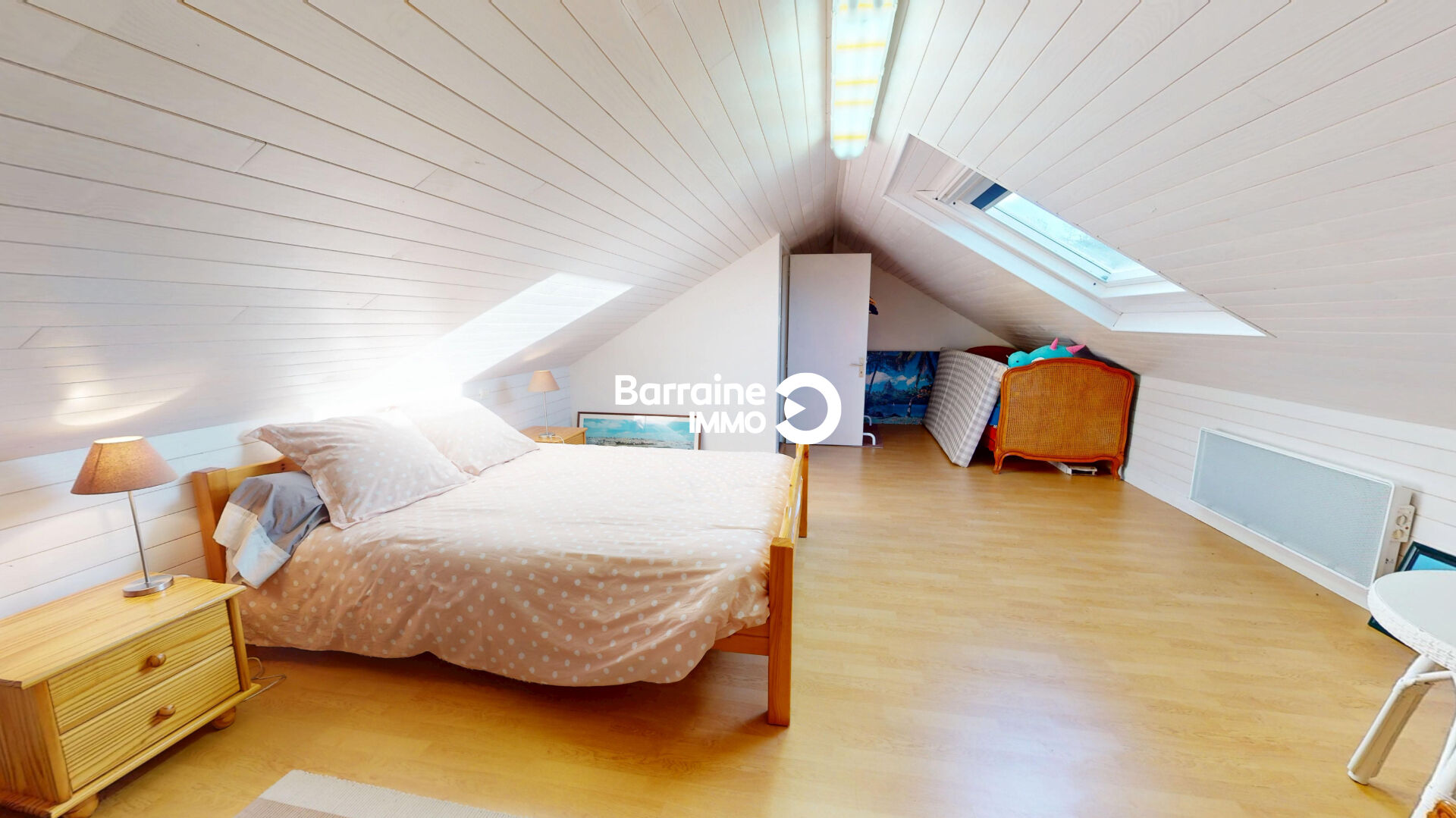 A l’étage, une quatrième chambre offre une pièce supplémentaire chaleureuse, idéale pour recevoir ou aménager un bureau.