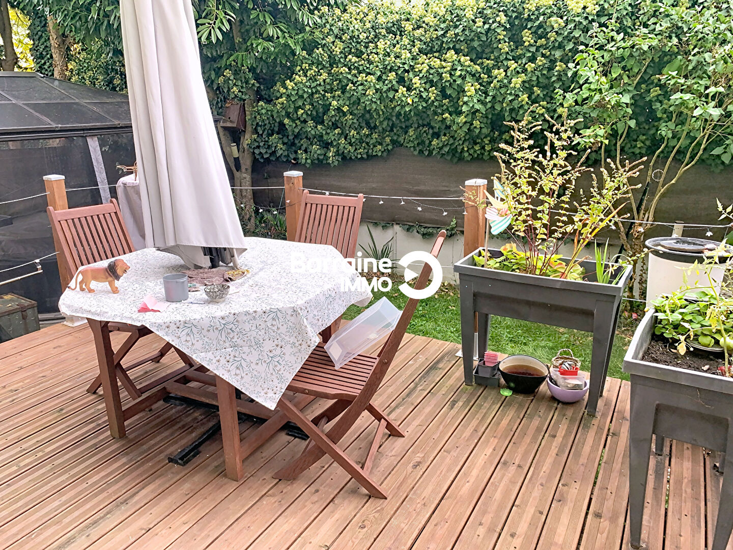 Pour ce qui est de l’extérieur, une terrasse sur pilotis et un jardin clos au calme et orienté au SUD vous attend.