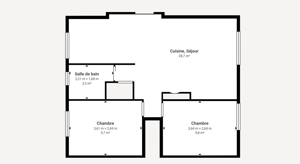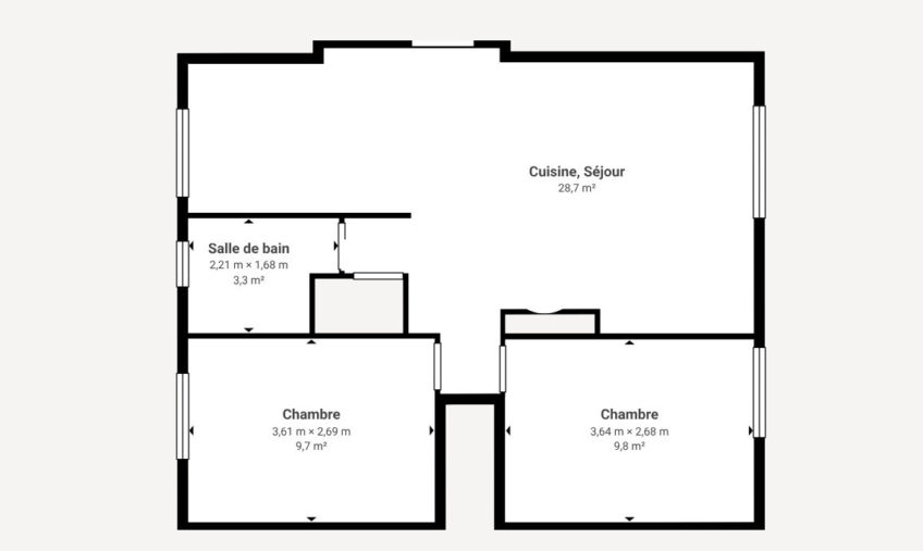 Ce bien de 51.35 m² offre un séjour lumineux de 14.16 m² exposé Est, une cuisine aménagée, 2 chambres, une salle d’eau et un WC séparé.