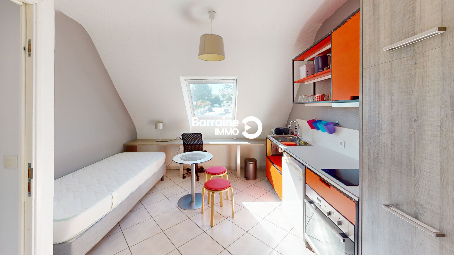 Il se compose d’une pièce de vie lumineuse d’environ 9 m², d’une cuisine ouverte entièrement aménagée et équipée, ainsi que d’une salle d’eau avec toilettes.
