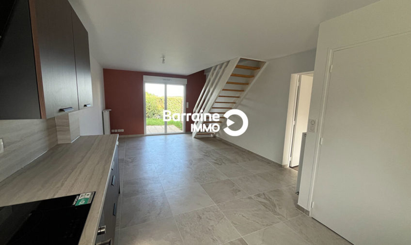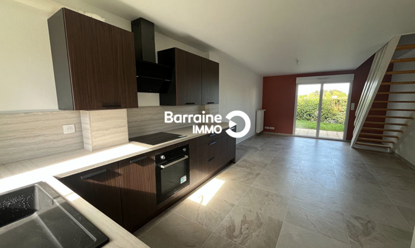 En location : dans un quartier calme de CAUDAN (56580), ayez le coup de coeur pour cette maison de 4 pièces louée vide. Elle se compose au rez-de-chaussée d’un salon/ séjour ouvert sur une cuisine aménagée et équipée et d’une chambre. A l’étage : 2 chambres dont une avec placard et une salle de bains avec wc.